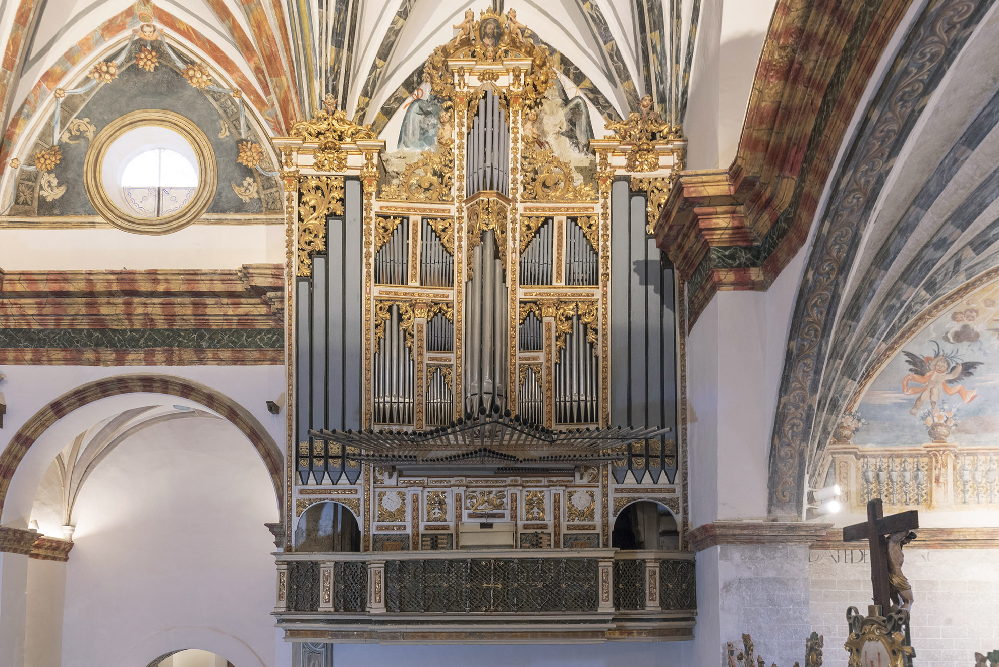 La entrada a la iglesia, situada en el lado de la Epístola, está precedida por un gran pórtico rectangular abierto por tres arcos de medio punto, el central de los cuales tiene mayor altura y anchura y está flanqueado por pilastras. La mitad inferior del pórtico está construida con piedra, pero tanto los arcos como el hastial superior son de ladrillo. Al parecer, el espacio interior del pórtico estuvo cubierto por una bóveda de lunetos, que quedaría dividida en tres tramos por dos arcos fajones transversales que todavía se conservan, con sus intradoses decorados con relieves geométricos.