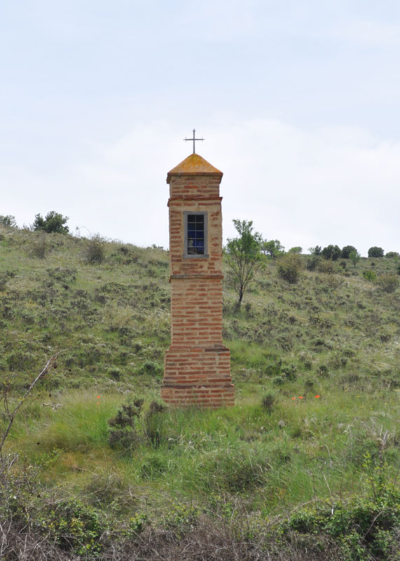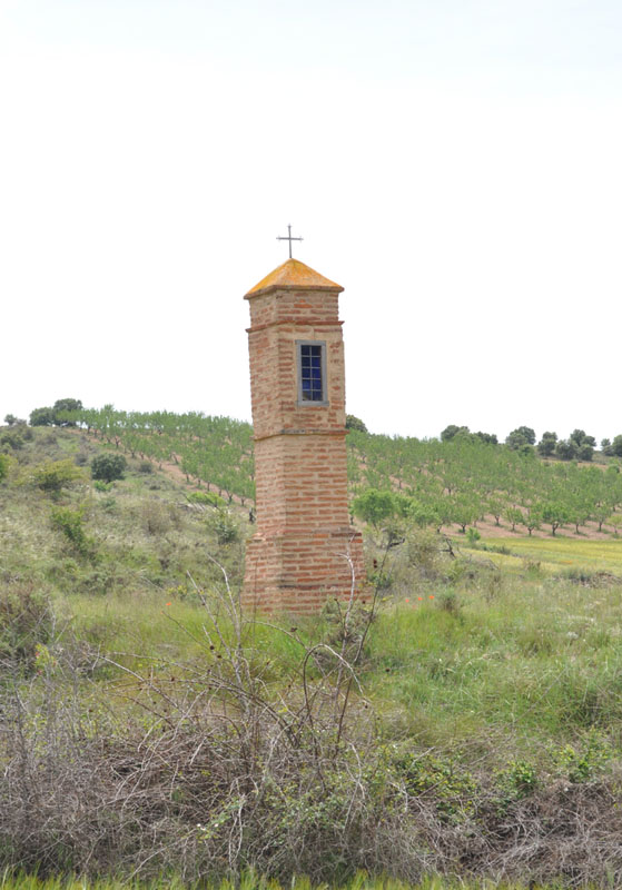 Es un esbelto prisma de sección cuadrada hecho de ladrillo rojizo. Arranca directamente del suelo rocoso y entre finas cornisas separa las distintas partes de su cuerpo: basa de más anchura que el resto; tronco sin adornos en el ladrillo; y el edículo, con un vano rectangular que cobija la imagen de San Cristóbal y sobre él su cimacio piramidal a cuatro aguas que descansa sobre un pequeño cuerpo prismático de cuatro hiladas de ladrillo, se remata con una minúscula cruz de hierro.